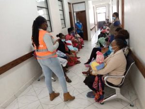 A photo showing Clara raising awareness in a health facility.